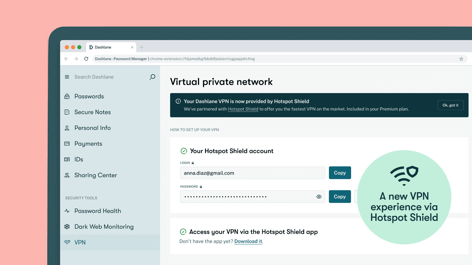 Dashlane has partnered with Hotspot Shield to offer a fast and more reliable VPN experience to our users—directly through Hotspot Shield’s app.