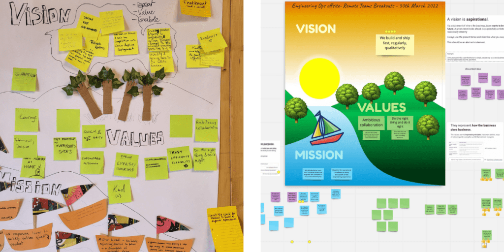 Example: Mission/ Vision/ Values exercise in-person (left) vs remote (right):