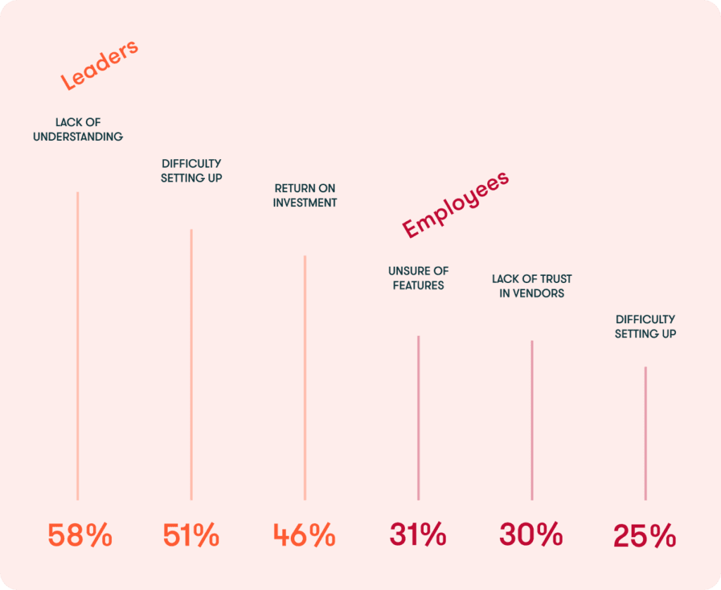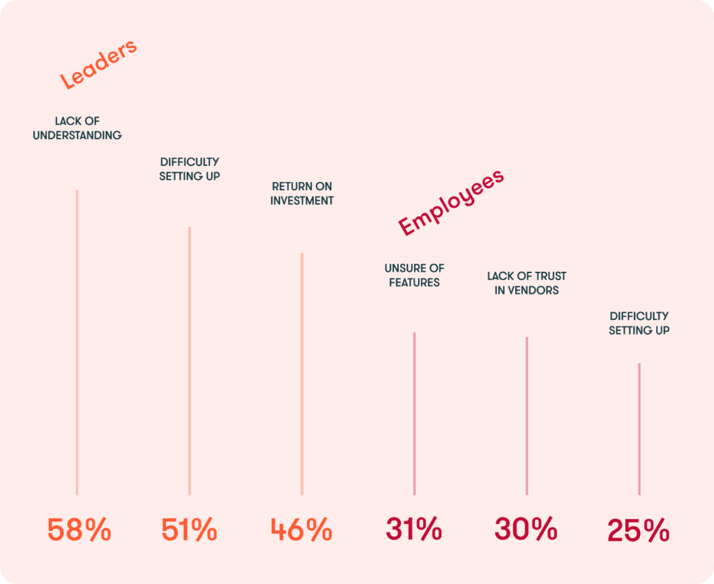 - Lack of understanding about the features is a much greater barrier for leaders than employees—with 58% of the former citing “unsure of features” as the top barrier, compared to 31% of the latter