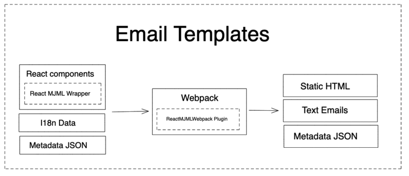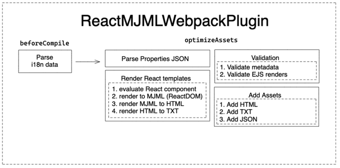 The goal is to end up with a build system that looks something like the image above. All components will be built on React/MJML with some JSON metadata. Webpack will drive compilation and take that React code and data to build the files and we will end up with static HTML and some other necessities like metadata and plaintext versions of the emails. Most of the work will happen in a custom built Webpack plugin which we call ReactMJMLWebpackPlugin. This plugin will handle a few different phases of compilation: