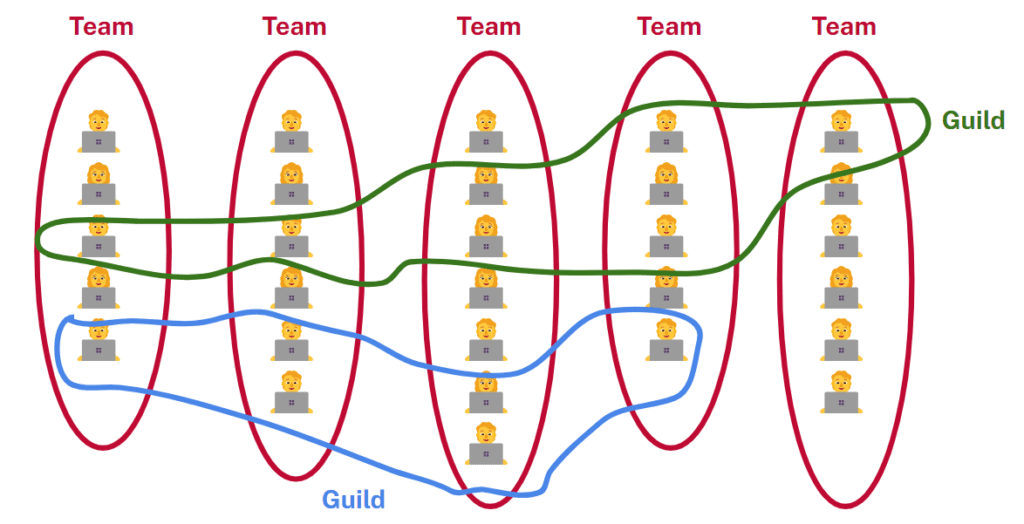 To ensure we wouldn’t lose strong platform identity and technical communities, we introduced the notion of guilds: A community of engineers interested in a technical stack and ecosystem. We created different guilds, such as the Apple Guild, the Android Guild, the Web Guild, and the Server Guild. Those communities meet regularly to discuss the vision and strategy for the stack, share practices, and improve technical processes. They’re supported by the platform teams associated with the guilds.