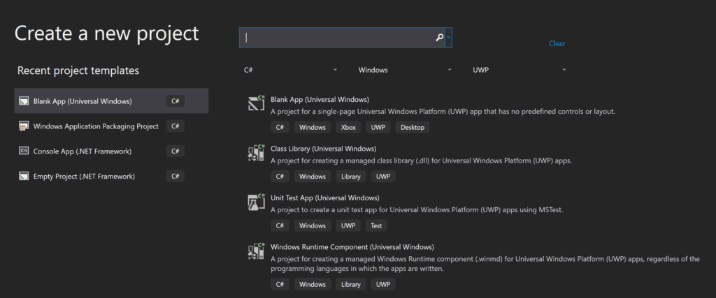 VisualStudio introduced UWP app projects back in 2015. To create a new UWP app project, start by installing "Universal Windows Platform development" using Visual Studio installer.