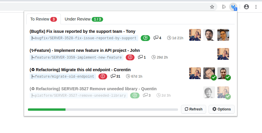 The extension is displayed at any time in your browser top bar and shows a badge with the number of merge requests that need your attention. When you click on it, a popup appears with the list of merge requests you are assigned to. The ones you already reviewed are grayed at the bottom so you can focus only on the pending ones.