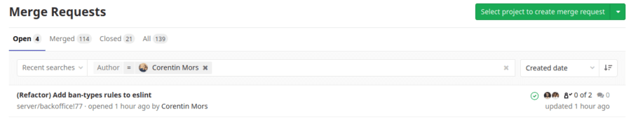The second tab shows the merge requests you created and tells you which ones are good to be merged. I made sure to display as much information as I could need without opening GitLab, such as: who already reviewed the merge request, the creation date, the number of comments, the title and description, as well as the branch name so you can checkout easily on it to start your review.