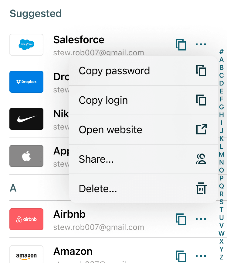 Speaking of saving time, we've also added something we call "quick actions" to your items. Tap the three dots on the righthand side of each item listed in your Vault to bring up a mini-menu that will allow you to copy different parts of your credentials or personal data, share or delete the item, or open the corresponding website. Like we said—saving you taps!
