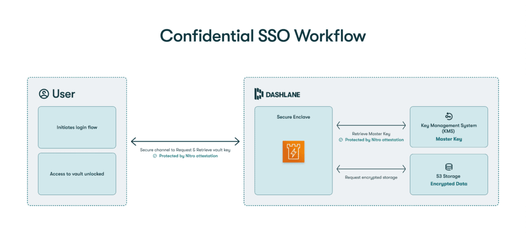 Confidential SSO allows for an easier setup and additional protection for a secure SSO integration. This innovative technology is powered by our patent-pending use of AWS Nitro Enclaves. The secure environment of AWS Nitro Enclaves completely replaces the need for self-hosted encryption services and still maintains Dashlane's zero-knowledge encryption standards, providing businesses with enhanced security throughout the authentication and provisioning process. Only the authorized user has access to the encrypted data in the vault.
