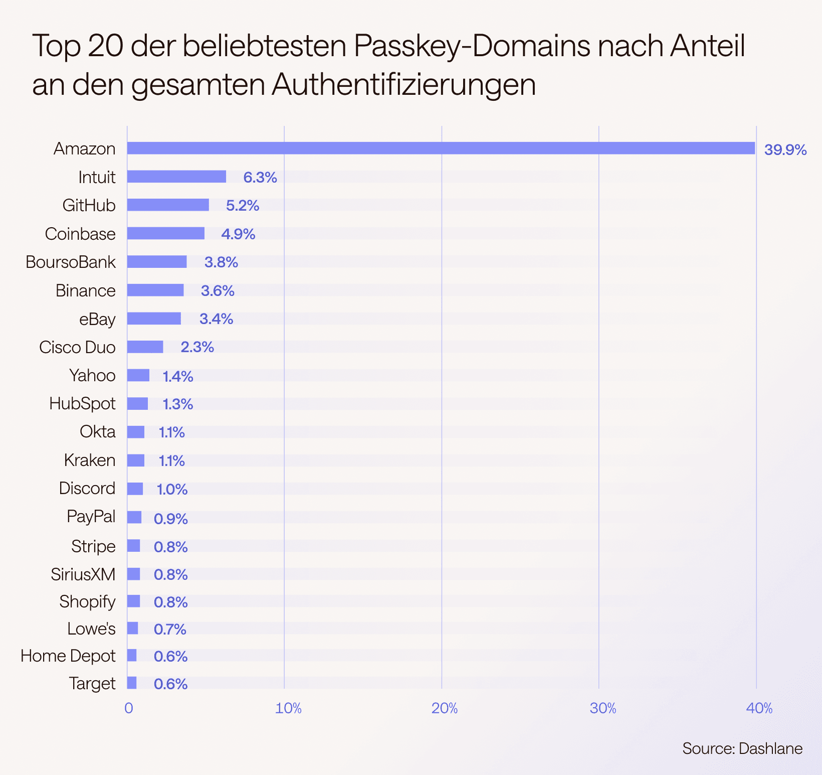 Die Dashlane Passkey Power 20 basiert auf einer Analyse von Dashlane-Daten, die Millionen anonymisierter und aggregierter Web- und Mobile-Passkey-Authentifizierungen umfassen (z. B. kann Dashlane sehen, welcher Prozentsatz aller Nutzer Zugangsdaten für eine bestimmte Website besitzt, jedoch nicht, ob ein einzelner Nutzer diese Zugangsdaten besitzt) aus dem vergangenen Jahr.