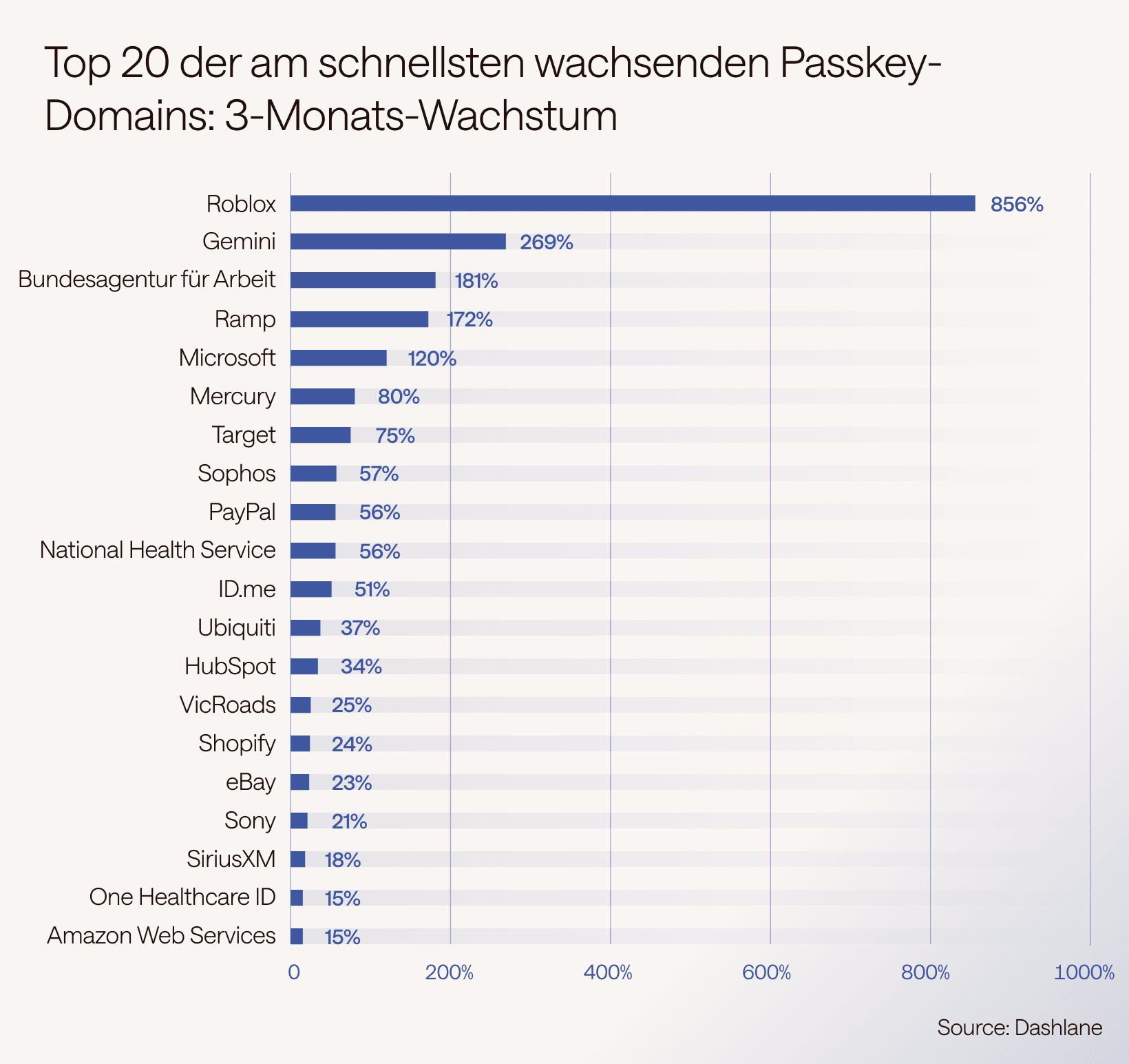Unternehmen, die Geschäftskunden bedienen, darunter Ramp (172 %), Sophos (57 %), HubSpot (34 %) und Ubiquiti (37 %), treiben ein signifikantes Wachstum bei Passkeys voran. Dies signalisiert das Vertrauen von Unternehmen in passwortlose Authentifizierung, um sensible Daten zu schützen und gleichzeitig die Benutzererfahrung zu verbessern.