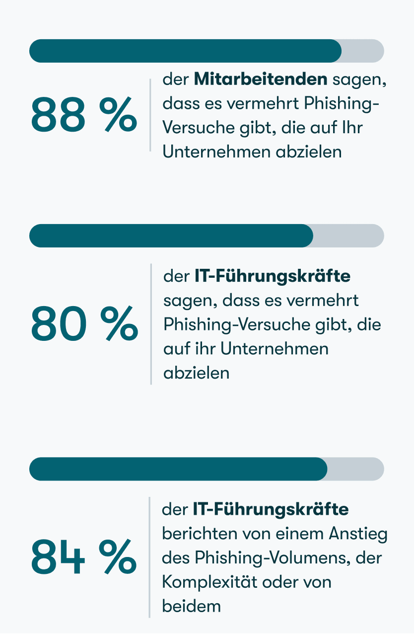 Um Erkenntnisse über die Auswirkungen dieser Veränderungen sowie über andere Sicherheitsherausforderungen zu erhalten, haben wir 1.000 Angestellte und 500 IT-Führungskräfte in den USA befragt. Sehen wir uns einige der Erkenntnisse zu KI-gestütztem Phishing an.
