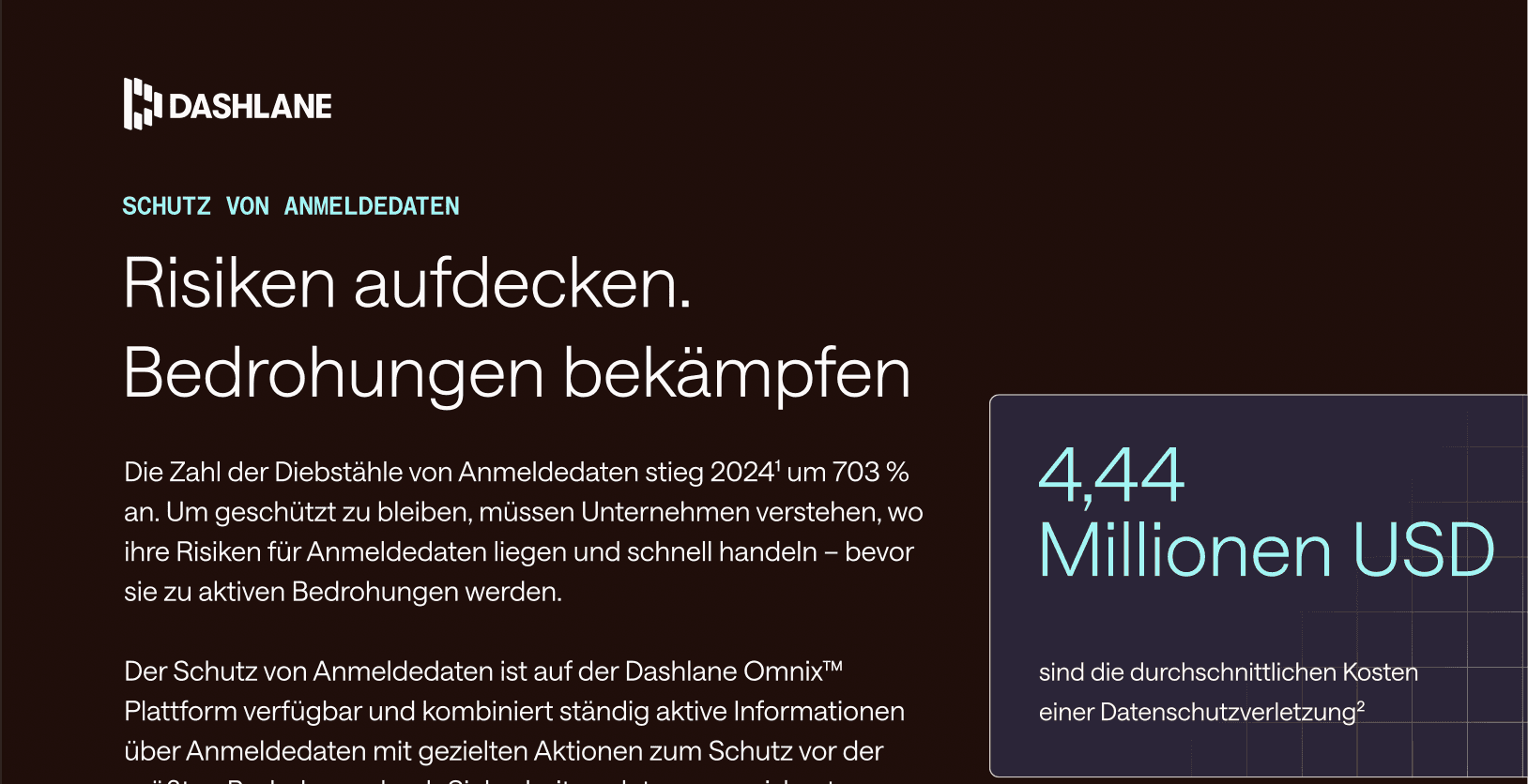 Wir präsentieren Credential Protection, Teil der Dashlane Omnix™-Plattform, mit dem Sie Risiken von Anmeldedaten identifizieren, Reaktionen automatisieren und Phishing-Angreifer überlisten.