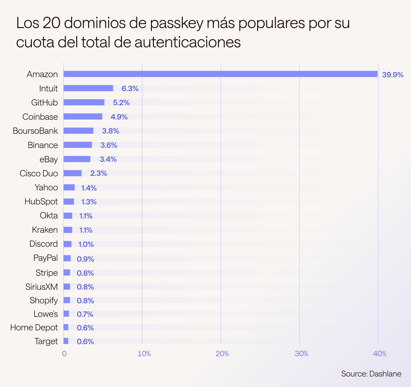 Los dominios del Power 20 se clasifican según la proporción de autenticaciones totales en el último año, excluyendo a Google como proveedor de plataforma. Estas clasificaciones reflejan tanto el tamaño de la base de usuarios de cada dominio como la frecuencia con la que sus aplicaciones requieren autenticación. Los servicios frecuentes y pegajosos naturalmente generan más actividad de passkeys.