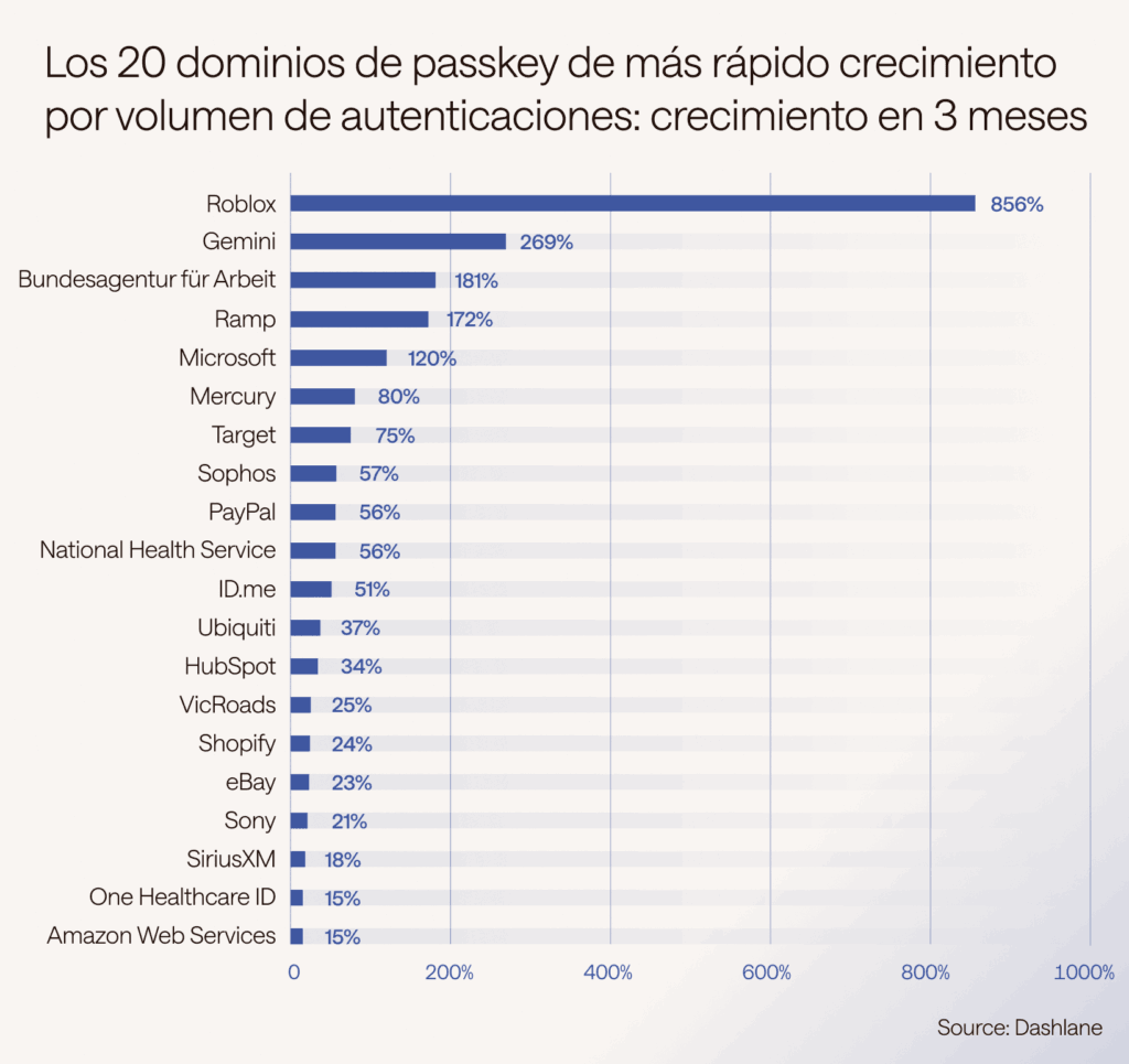 La urgencia es aún más evidente en nuestra lista de crecimiento más rápido, donde Gemini fue noticia en mayo de 2025 al requerir que todos los usuarios configuraran una passkey para acceder a sus cuentas, siendo una de las primeras plataformas importantes en exigir autenticación sin contraseñas.