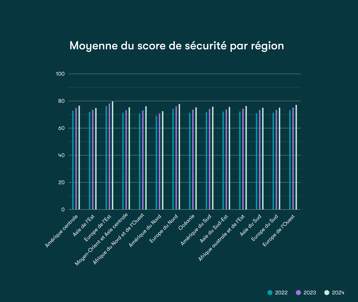 Si l'on considère l'ensemble des régions, le score de sécurité moyen en 2024 se situe entre 72,6 (Amérique du Nord) et 79,8 (Europe de l'Est). Bien que chaque région se situe dans la fourchette « Amélioration nécessaire » (score entre 60 et 90), toutes les régions ont amélioré leur score de 2 à 4 % au cours de l'année écoulée.