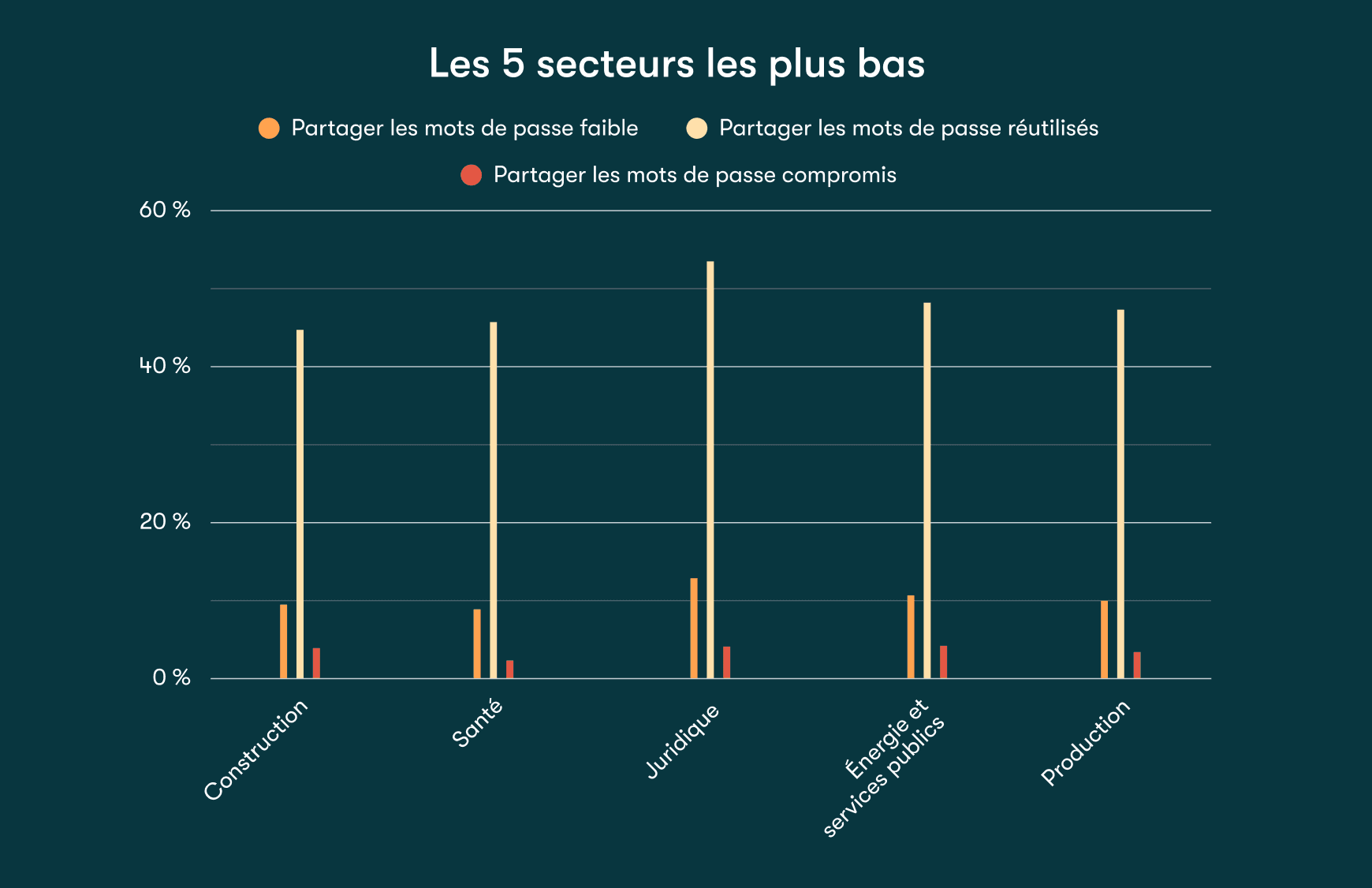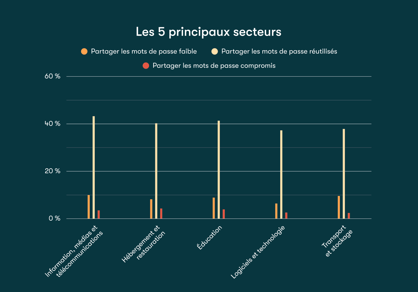 Nous avons également examiné les secteurs d'activité affichant le meilleur et le pire score de sécurité des mots de passe. Depuis la publication de notre premier rapport, les utilisateurs de Dashlane du monde entier ont vu leurs scores de sécurité augmenter chaque année, soulignant que la connaissance est synonyme de pouvoir lorsqu'il s'agit de sécurité. Les avancées en matière de sécurité sont souvent progressives, et, les clés d'identification et autres technologies sans mot de passe étant encore aux premiers stades d'adoption, les identifiants compromis et non sécurisés demeurent un risque que les entreprises devront continuer à gérer dans les années à venir.