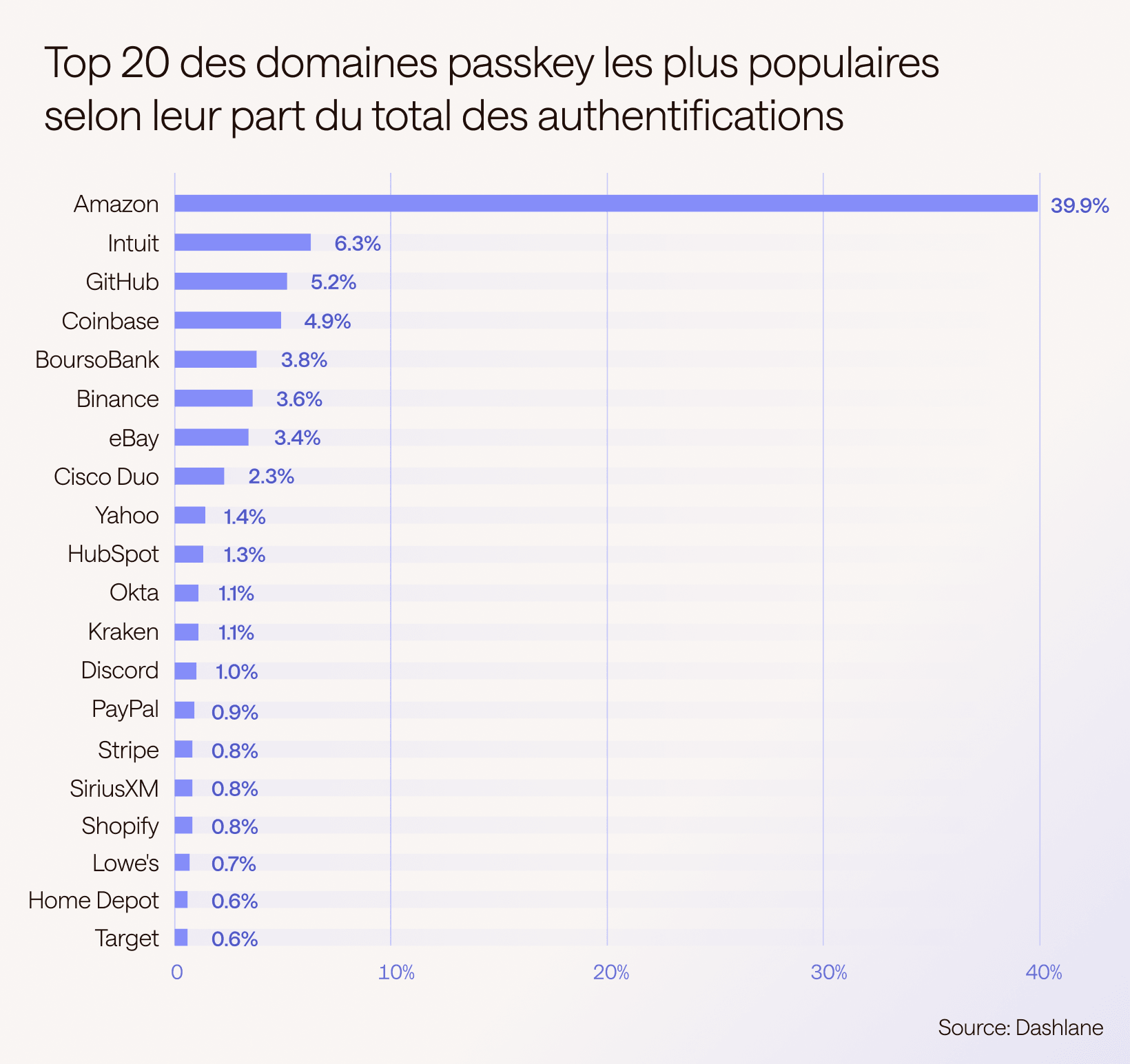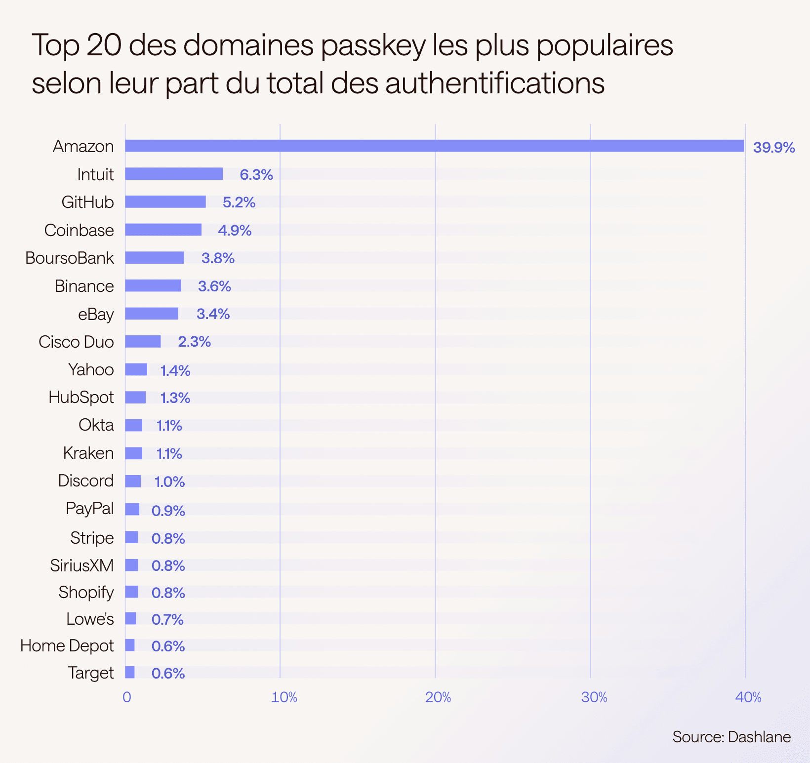 Le Top 20 des Passkeys Dashlane 2025 repose sur l’analyse de données Dashlane englobant des millions d’authentifications passkey web et mobile agrégées et anonymisées à l’échelle mondiale au cours de l’année écoulée. En tant que premier gestionnaire de crédentiels à prendre en charge les passkeys sur toutes les grandes plateformes, Dashlane bénéficie d’une position unique : nos données reflètent les comportements d’authentification grand public dans les environnements consommateurs et entreprises.