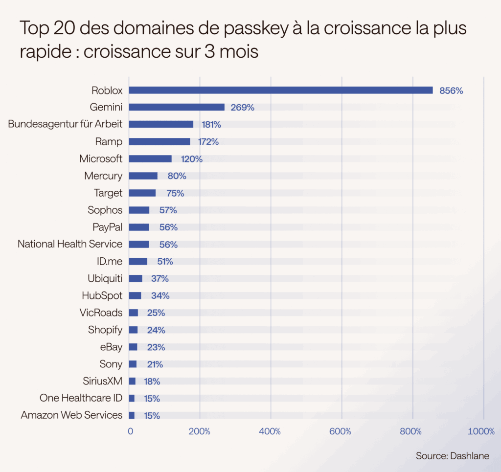 Mercury (croissance de 80 %) et PayPal (56 %) illustrent la dynamique continue dans la fintech, consolidant les passkeys comme méthode de connexion privilégiée pour les transactions financières sécurisées. Pour les plateformes manipulant de l’argent, l’adoption des passkeys est à la fois un impératif de sécurité et un signal de confiance pour les utilisateurs.