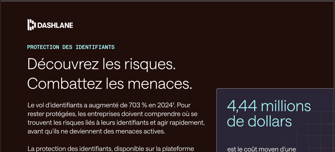 Présentation de la protection des identifiants, qui fait partie de la plateforme Dashlane Omnix™, qui vous aide à identifier les risques liés aux identifiants, à automatiser la réponse et à déjouer les attaques de phishing.